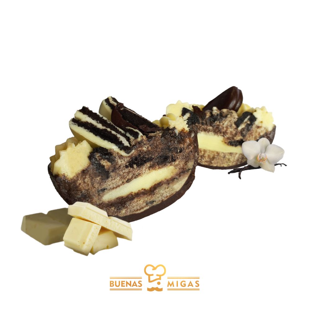 Huevo de Pascua relleno de Oreo y mousse de chocolate blanco. Base de mousse de chocolate blanco, relleno con crema de Oreo, y decorado con chocolate amargo y bombones que aportan textura y un contraste irresistible. Un huevo de Pascua premium pensado para los amantes del chocolate y los rellenos intensos.