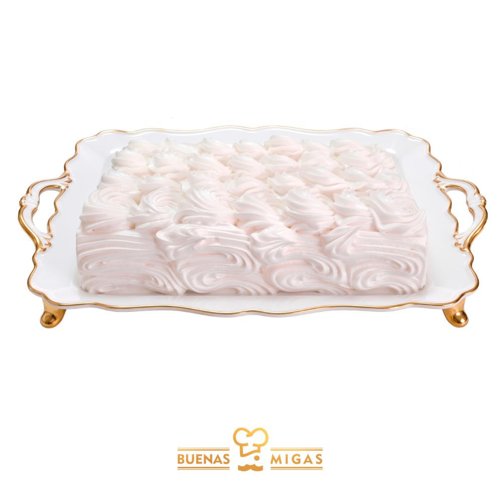 Bizcochuelo de vainilla con relleno de dulce de leche o mousse de chocolate decorada con merengue.